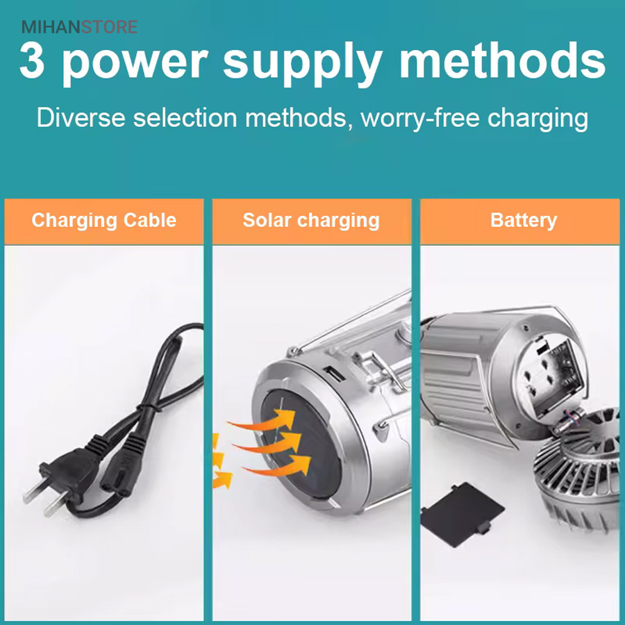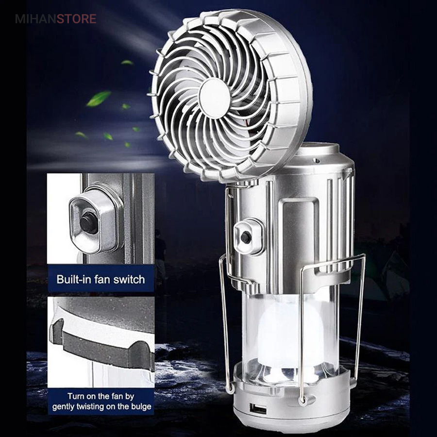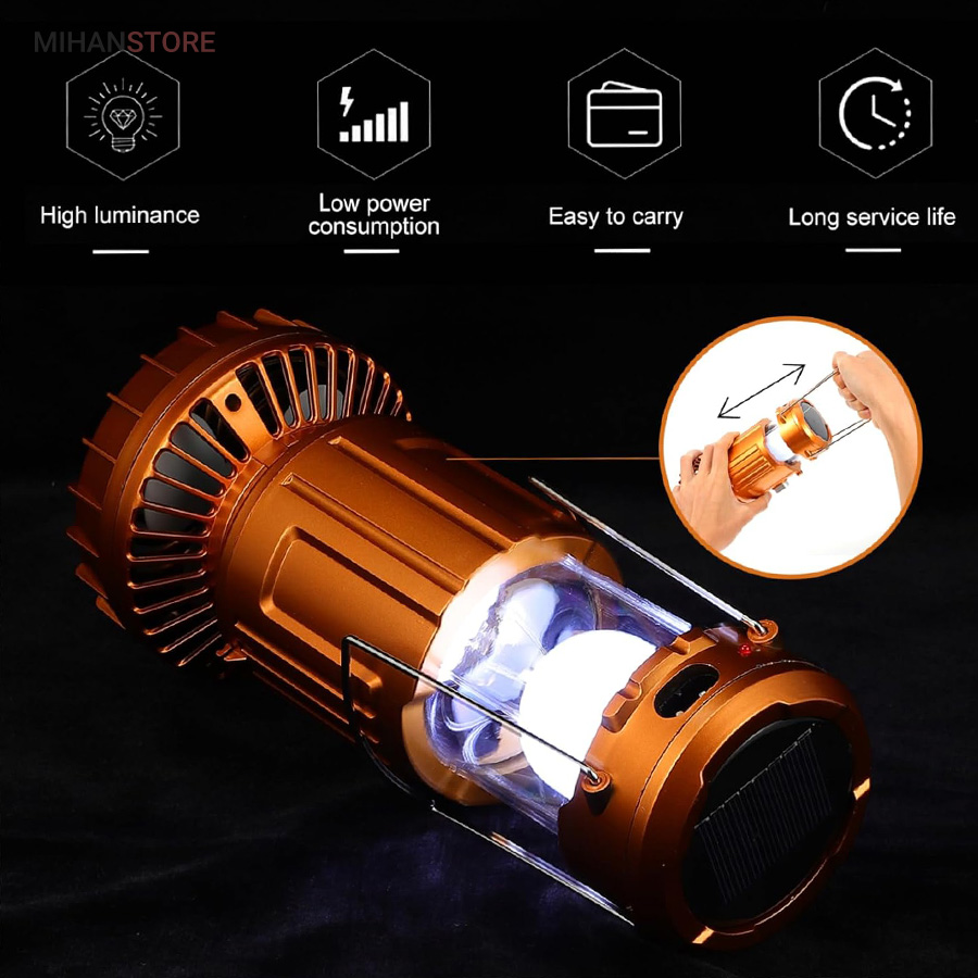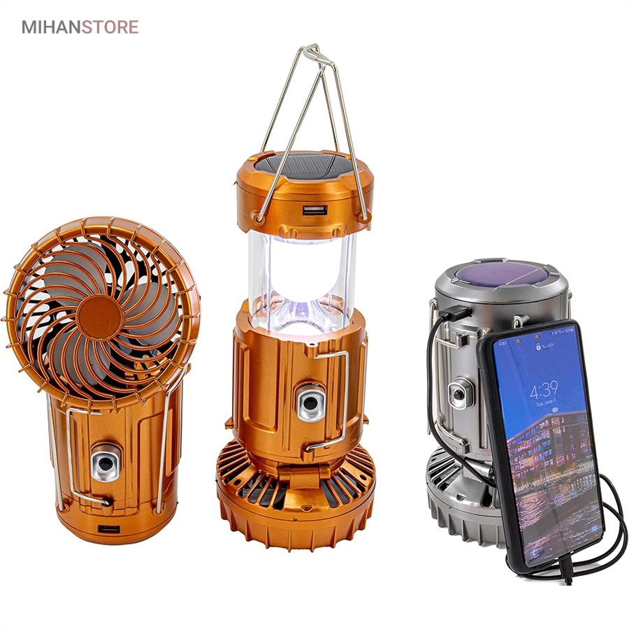 چراغ کمپینگ خورشیدی دارای پنکه و پاوربانک محصولی ساده درعین‌حال کاربردی است که می‌تواند در زمان سفر یا در شرایط اضطراری در شهر مورد استفاده قرار گیرد. در قسمت بالایی این فانوس، دو دسته‌ی فلزی قرار دارد؛ به همین دلیل می‌توان آن را داخل چادر یا هر سطح برجسته‌ای آویزان کرد و از نور آن بهره برد. چراغ کمپینگ و پاوربانک خورشیدی چندکاره همراه خوبی برای سفر به طبیعت، کوه‌نوردی و پیاده‌روی در هنگام شب هستند. گاهی ما به مکانی سفر می‌کنیم که نور کافی در آن وجود ندارد؛ در این صورت، داشتن یک لامپ فانوسی بسیار ضروری به نظر می‌رسد. همچنین از لامپ آن به‌صورت کشویی استفاده خواهید کرد و در صورت نیاز می‌توانید آن را باز کرده، به‌راحتی از روشنایی این لامپ فانوسی بهره‌مند شده و محیط پیرامون خود را روشن کنید. چراغ کمپینگ و پاوربانک خورشیدی چندکاره انتخابی خوب و باکیفیت برای داشتن سفری خوش است که می‌توانید از آن برای روشن‌کردن چادر، اتومبیل یا هر محیط تاریک دیگری استفاده کنید.
